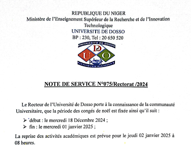 La reprise des activités académiques est prevue pour le jeudi 02 janvier 2025 à 8heures.