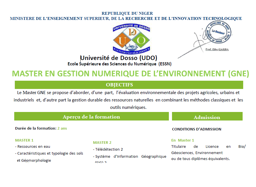 Communiqué – Appel à candidature pour le recrutement d’étudiants pour le Master en Gestion Numérique de l’Environnement (GNE) pour l’année universtaire 2024-2025