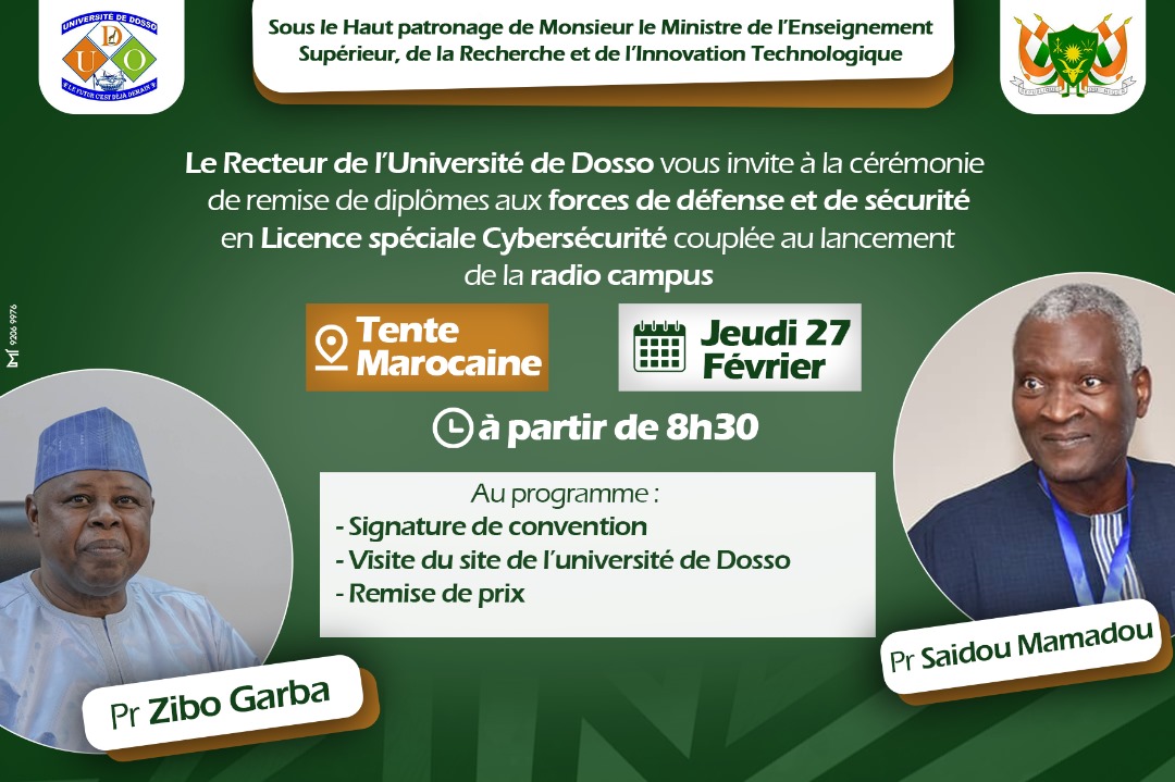 L’Université de Dosso vous invite à la cérémonie de remise de diplômes aux forces de défense et de sécurité qui ont effectué la Licence spéciale « Appel à participation – Cérémonie de remise de diplômes aux forces de défense et de sécurité »