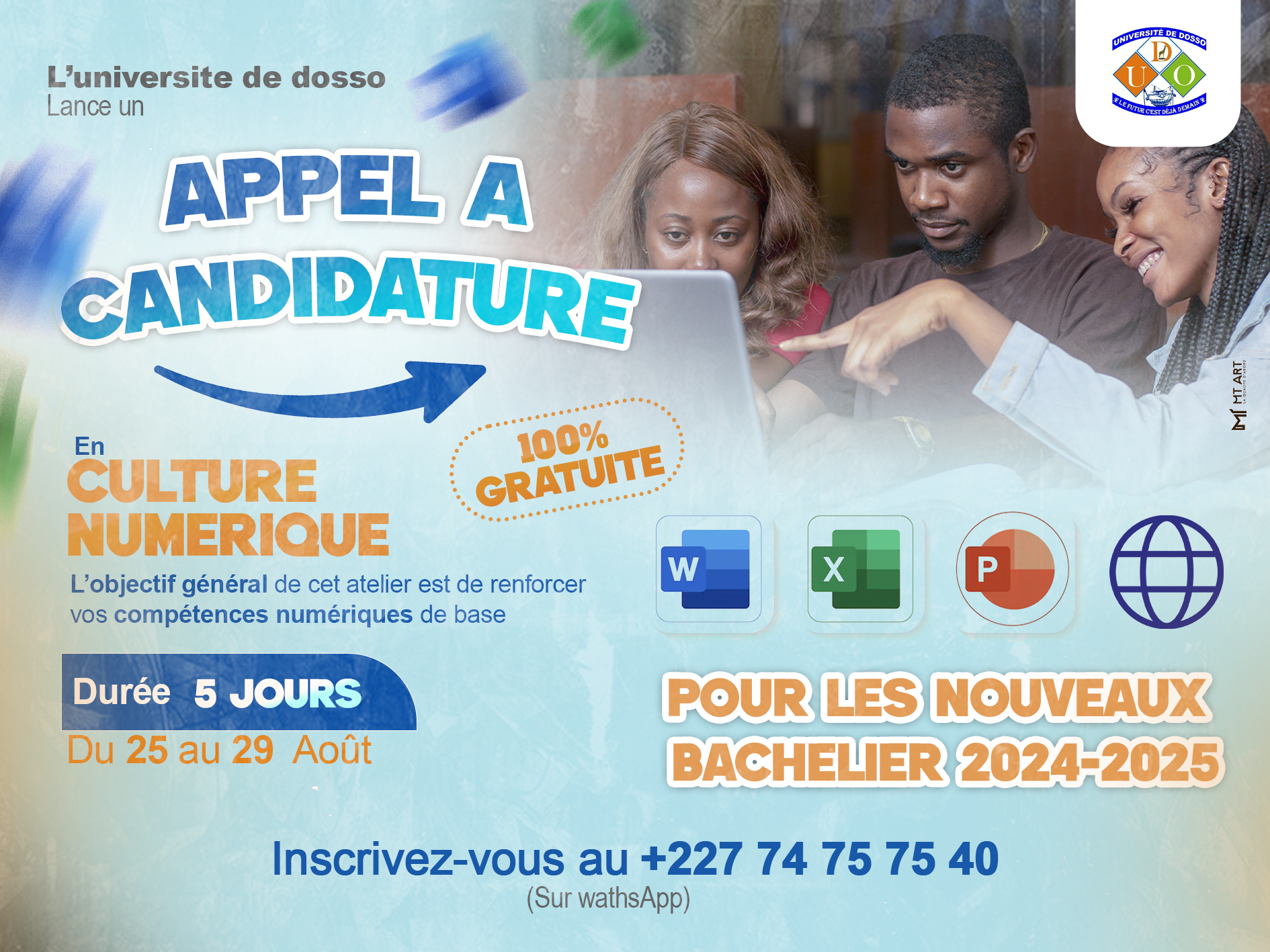 L’Université de Dosso organise, du 25 au 29 août 2025, un atelier de formation en informatique de base, entièrement gratuit, destiné aux nouveaux bacheliers de « Atelier de formation en culture numeriques pour les nouveaux bacheliers »
